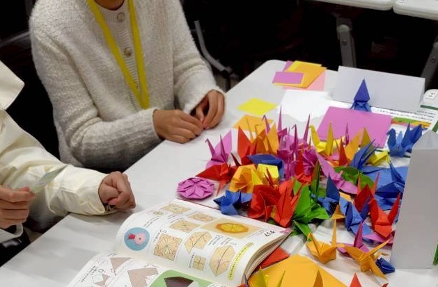 これまでに実施した模造紙や最終報告書(小冊子)の展示、履修を考えている学生に向けた「学部横断Alumni」メンバーによるメッセージボード、社会人基礎力をモチーフにしたカードゲームはもちろんのこと、まだ横断ゼミを履修したことのない学生や白雉祭に来られる高校生を対象にした「模擬横断ゼミ」の授業構成の企画も実施しました。そして過去に課題提供をしてくださった「オタフクソース株式会社 (2023年度春学期)」、「株式会社竹尾(2025年度春学期)」にも今回改めてご協賛いただき、新たな企画を考案しました。具体的には、株式会社竹尾様からの協賛品である“紙”を用いた「利き紙体験」「メッセージカード体験」「折り紙・折り鶴体験」などです。さらにここでの折り鶴を、オタフクソース株式会社の本社所在地である広島の平和記念公園内にある「原爆の子の像」へ寄贈いたしました。