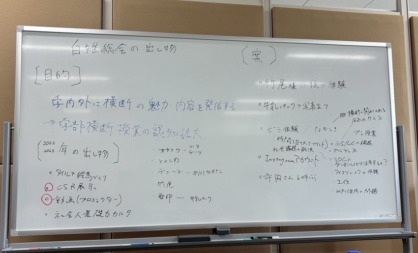 まず本プロジェクトが動き始めたのは2025年5月ごろです。2025年度は白雉祭に参加可能なメンバーに恵まれ、2年振りに「学部横断Alumni」が出展をすることに決まりました。それからは、月に1回~2回対面やオンラインでどのような企画を実施するか話し合いました。なかなかスケジュール調整が難しい中、履修した時期の垣根を越えて、横断ゼミを広く認知してもらうためにどんな企画が良いのか、知恵を出し合い、工夫に努めました。